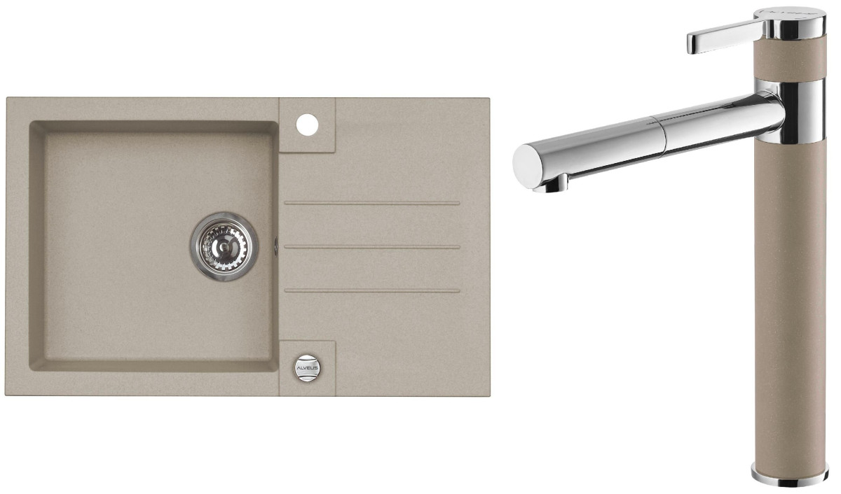 Alveus set Rock 130 02 + Zina 02 Materiál: Granit (Granital Plus) Prevedenie: Pebble 02 Rozmer drezu: 780 x 480 mm Rozmer drezovej nádoby: 400 x 400 x 180 mm Minimálna šírka skrinky: 600 mm Orientácia drezu: obojstraný, vaňa drezu môže byť vľavo ť sa zatvára a otvára otočením gombíka na dreze. Typ výpusti: Sitkový výpust 3 1/2 Spôsob montáže: Horný, drez je usadený nad pracovnú dosku Drez má z výroby zhotovené 2 otvory, do jedného otvoru si dáte batériu a do druhého excentrické ovládanie. Kuchynská batéria Alveus Zina Pebble 02 otočná, tlaková (klasická batéria pre pripojenie k vodnému poriadku alebo tlakovému ohrievaču) otvoru 35 mm Obsah balenia: granitový drez, príchytky, tesnenie nie je súčasťou balenia - pri granitových drezoch sa ako tesnenie používa silikón, sitkový ventil 3 1/2, sifón s odbočkou na umývačku, excentrické ovládanie výpustu, drezová batéria, pripojovacie hadičky, montážny balíček.