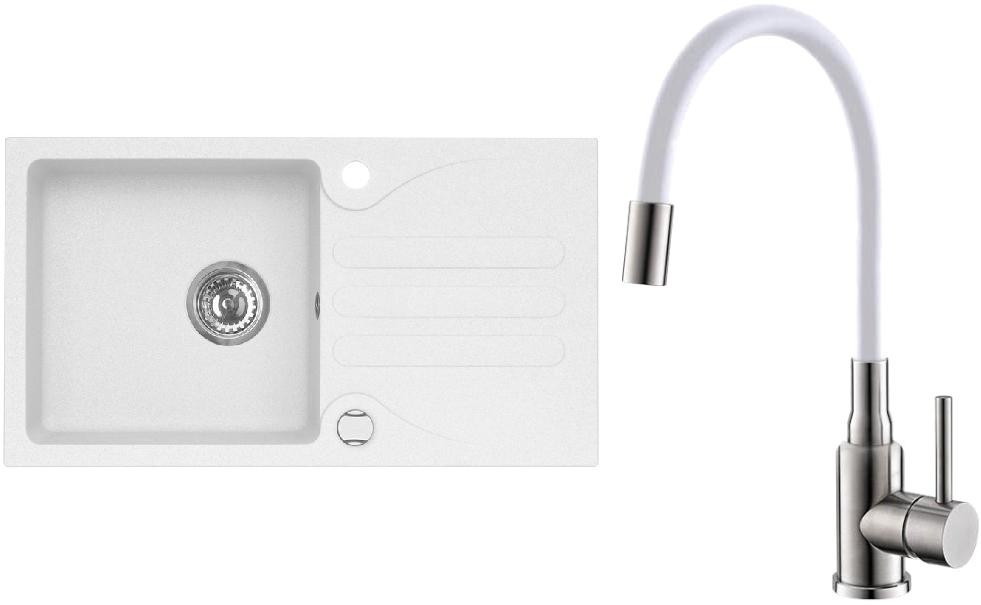 Kuchynský drez Alveus Galapagos 30 White 11. Materiál: Granit (Granital)Prevedenie: White 11. Rozmer drezu: 770 x 430 mm, - Rozmer drezovej nádoby: 380 x 370 x 150 mmMinimálna šírka drezu: 500 mm - Orient môže vpravoPrevedenie prepadu: - Prepad umiestnený vo vani drezu - Excentrické ovládanie výpuste - výpust sa zatvára a otvára otočením gombíka na dreze. - Typ výpustu: Sitkový výpust 3 1/2 - Spôsob montáže: horný, drez je usadený nad pracovnú dosku - Drez má z výroby zhotovené 2 otvory. - Do jedného otvoru si dáte batériu a do druhého excentrické ovládanie. - Kuchynská batéria Alveus Mintas biela / kefovaná oceľ, otočná tlaková (klasická batéria pre pripojenie k vodnému poriadku alebo tlakovému ohrievaču) mmMontáž do štandardného otvoru 35 mm Obsah balenia Granitový drezPríchytkyTesnenie nie je súčasťou balenia, pri granitových drezoch sa ako tesnenie používa silikónSitkový ventil 3 1/2, sifón s odbočkou na umývačkuExcentrické ovládanie výpustuDrezová batériaPripojovacie hadičkyMontážny balíček