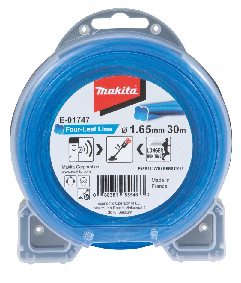 Makita E-01747 je nylonová štvorlístková struna s priemerom 1,65 mm a dĺžkou 30 m, navrhnutá špeciálne pre vyžínače a strunové kosačky. Jej špeciálny tvar zaručuje výrazne dlhšiu dobu práce na jedno nabitie akumulátora, čo zvyšuje efektivitu kosenia. Medzi jej výhody patrí aj podstatne tišší chod.